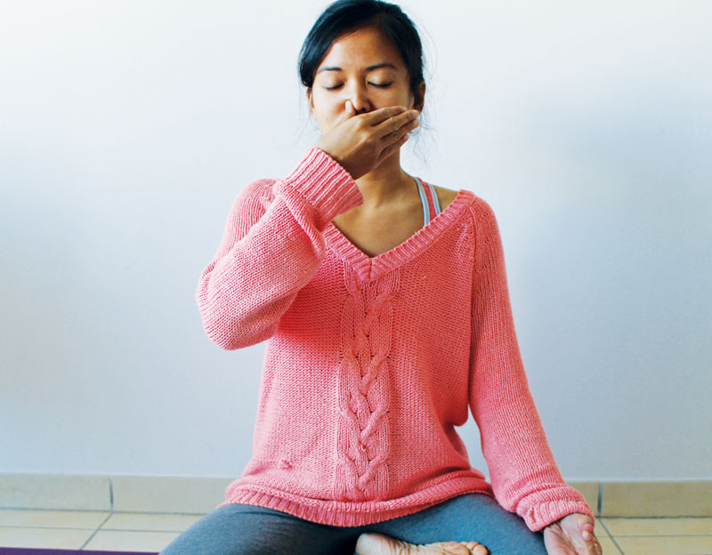 1. Assis confortablement, fermer la narine droite avec le pouce et à poumons vides, inspirer par la narine gauche puis maintenir le souffle, inspirer puis maintenir…