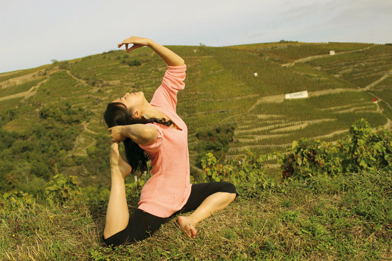 Kissline Mai, professeur de yoga à Orezen posant en posture du pigeon dans un champ de vigne.
