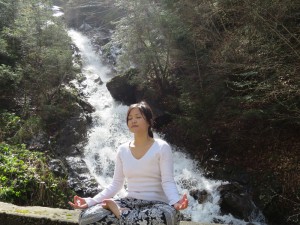 Kissline Mai professeur de yoga à Orezen yoga Lyon méditant devant une cascade en Savoie.