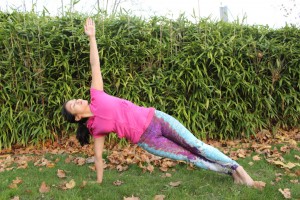 Vasisthasana ou la posture de la planche sur le côté réalisée par Kissline Mai professeur de yoga à Lyon.