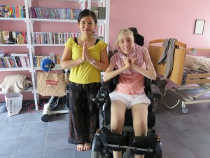 Photographie avec Muriel sur son fauteuil roulant et Kissline Mai, professeur de yoga à Lyon après une séance de Hatha yoga pour handicap.