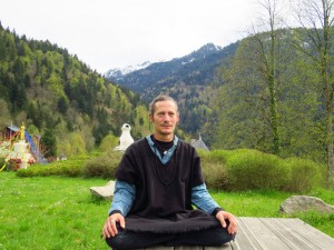 Olivier Hernandez alias Jangchub assis en tailleur en pleine nature à Karma Ling durant une retraite continue avec Orezen.
