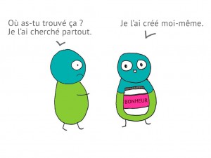Illustration avec un personnage demandant où as-tu trouvé cela ? Et l’autre qui tient un bocal avec l’étiquette « bonheur » répondant : « je l’ai créé moi-même ! »