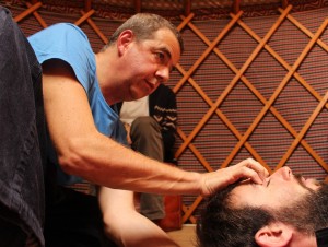 Photo de Luc exerçant un massage Shiatsu sur la tête d’un pratiquant d’Orezen yoga.