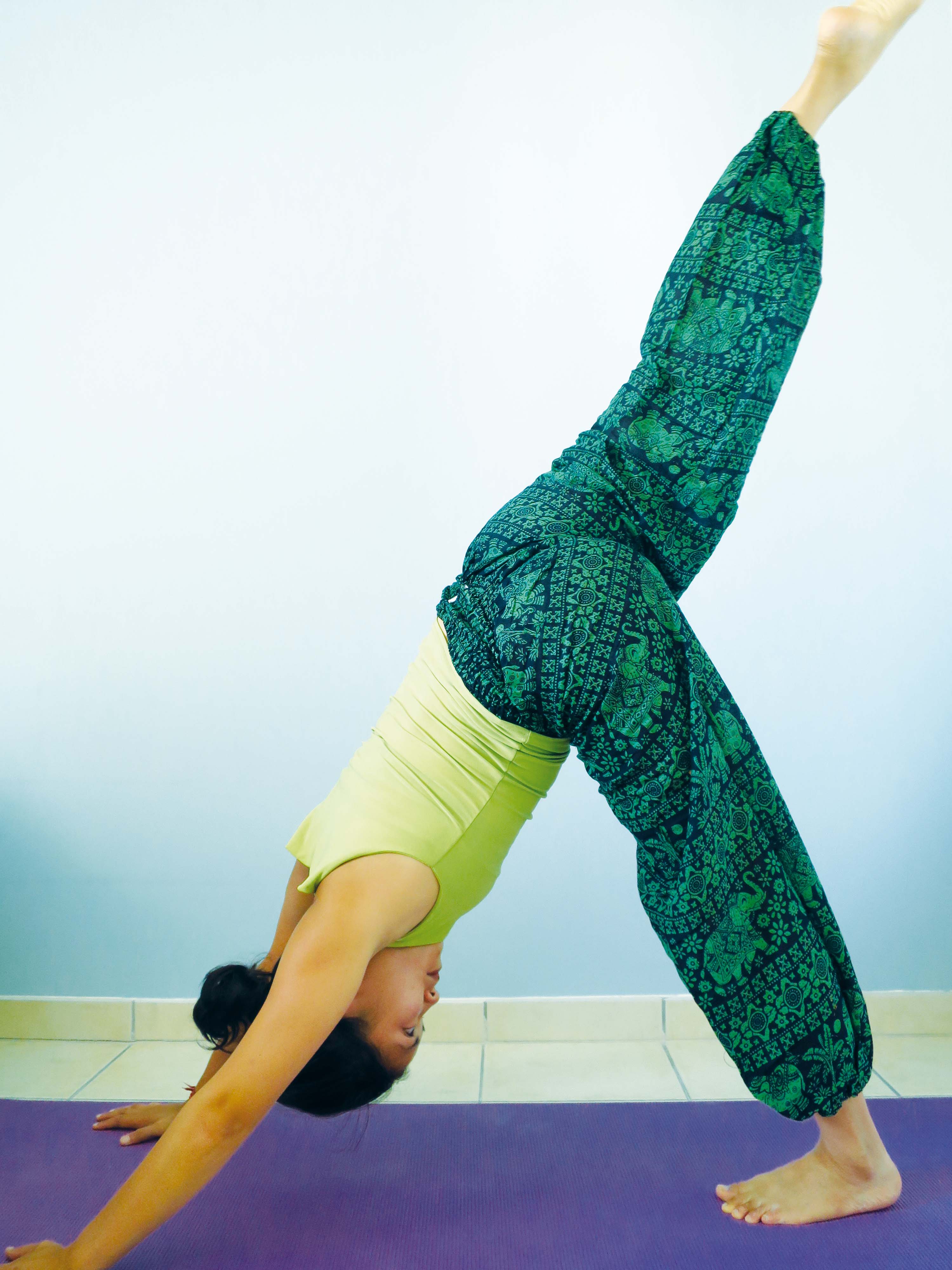Posture du chien tête en bas à trois pattes par Kissline Mai, professeur de yoga à Orzen Lyon