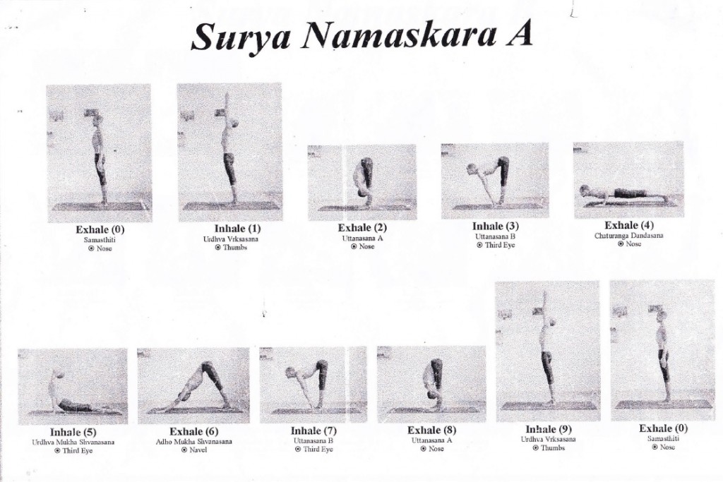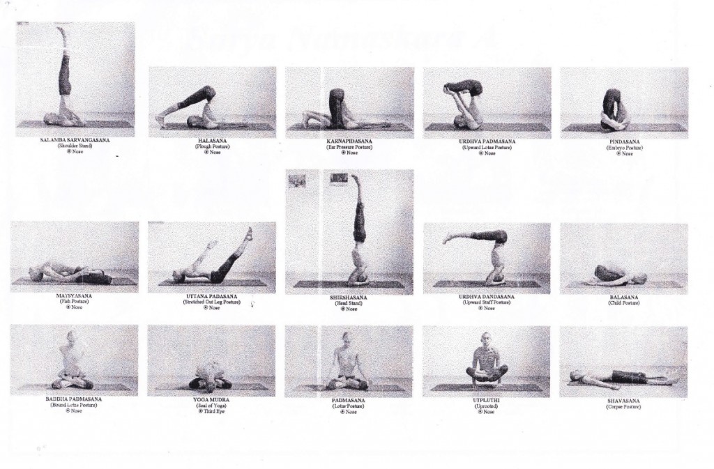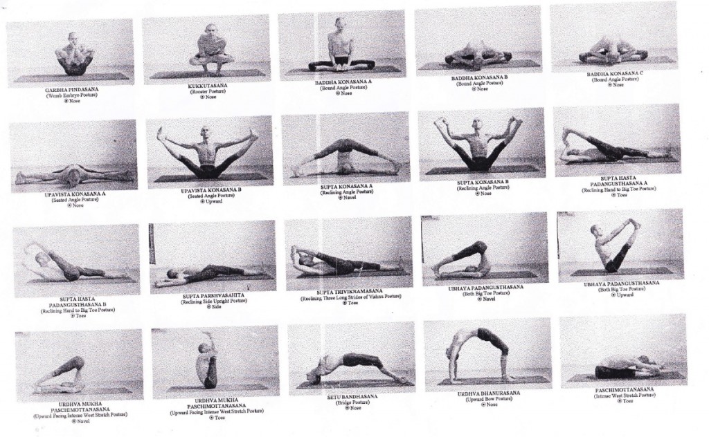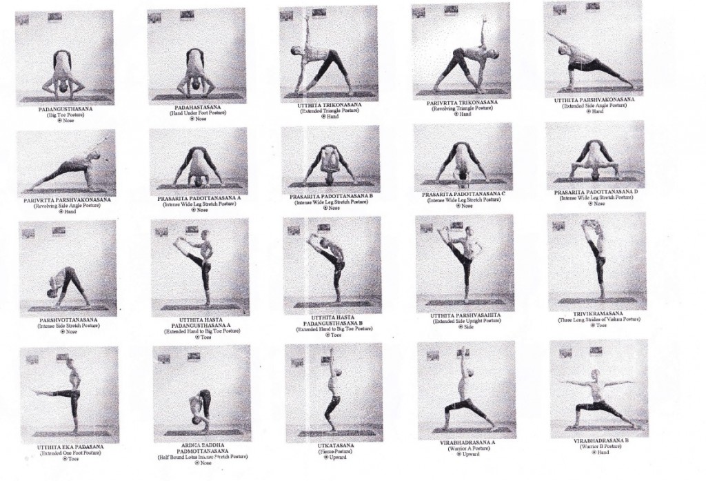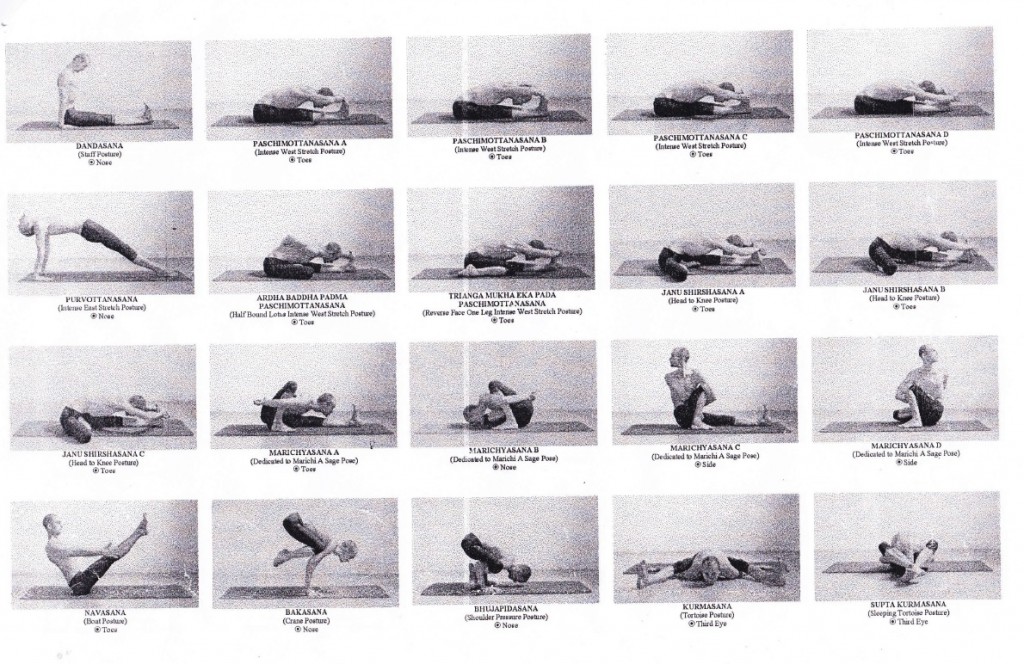 Pour ceux qui ont décidé de rejoindre le cours d’Ashtanga du lundi de 19h30 à 21h, voici en illustré la séquence de la 1ère série. L’ashtanga est basé sur des séquences dont le niveau de difficulté augmente selon les séquences. On les appelle première série, deuxième série, série avancée. La première série que nous pratiquerons ce trimestre est composée de 75 postures qui nécessitent de 1h30 à 2h pour être réalisées. Cela commence par les deux salutations au soleil A et B appellées « Surya namaskar ». Puis par des postures debout, assis, des inversions et back-bend. Chaque cours se termine avec une phase de relaxation. Nous verrons comment améliorer au fur et à mesure chaque posture. Quelques variations seront proposées avant de pratiquer librement lorsque les postures seront assimilées par les pratiquants. C’est avec grand plaisir qu’Orezen partage cette pratique puissante et méditative.