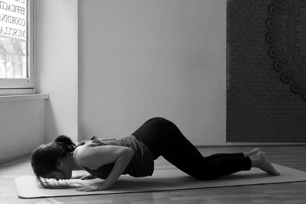 En expirant, relâcher les genoux au sol. Les hanches restent en l’air. Veillez bien à déposer uniquement les genoux et non tout le corps qui s’aplatit par terre. C’est un processus qui permet de bien étirer la colonne vertébrale pour les mouvements suivants. J’aime aussi l’idée d’y aller en douceur pour atterrir comme une plume qui se dépose sur la terre, comme un oiseau qui se pose, je touche d’abord des genoux le sol.