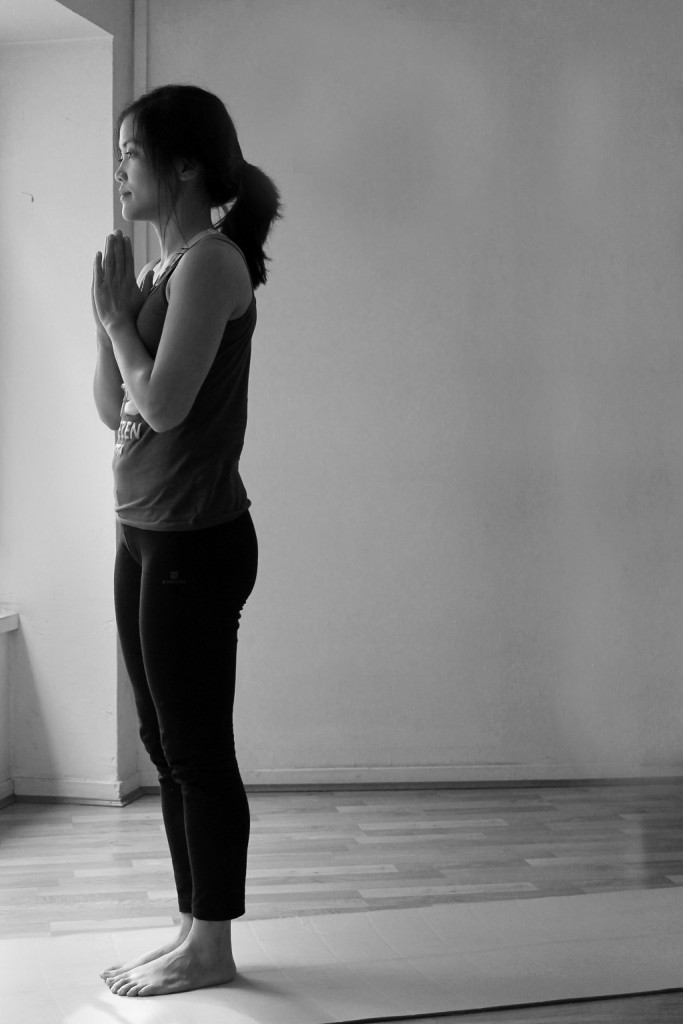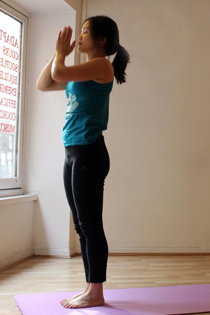 Il s’agit de la posture initiale. Se tenir droit, ferme, la colonne qui s’étire vers le haut. Pensez à relâcher vos épaules. Vous pouvez pratiquer les pieds écartés de la largeur de votre bassin. Souvent j’arrive à voir dès cette première posture comment va mon mental. Quand mon corps est bien ancré, je me sens posée et calme.