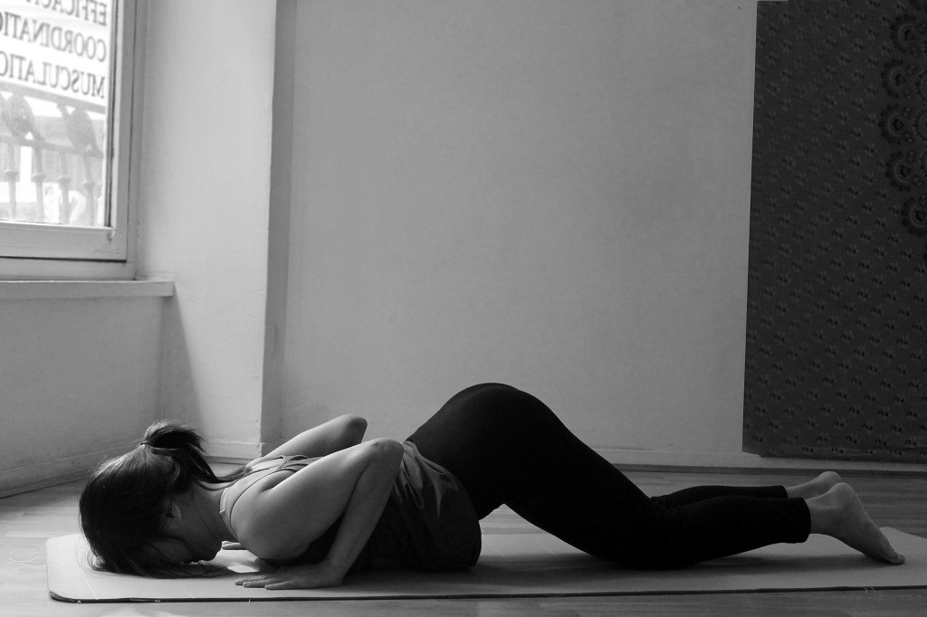 Depuis les genoux au sol, sans bouger le corps dans la posture, déposer la poitrine sur le sol. Elle doit arriver à hauteur de vos mains. Relâcher bien votre front. Ce contact avec la terre est un repos dans cette expiration.
