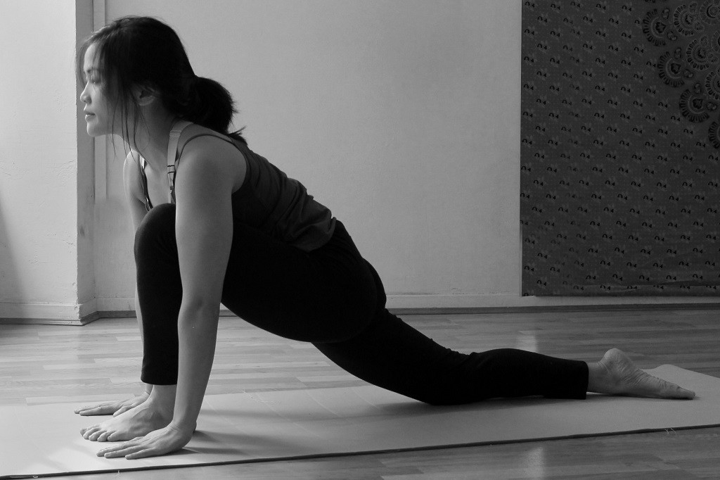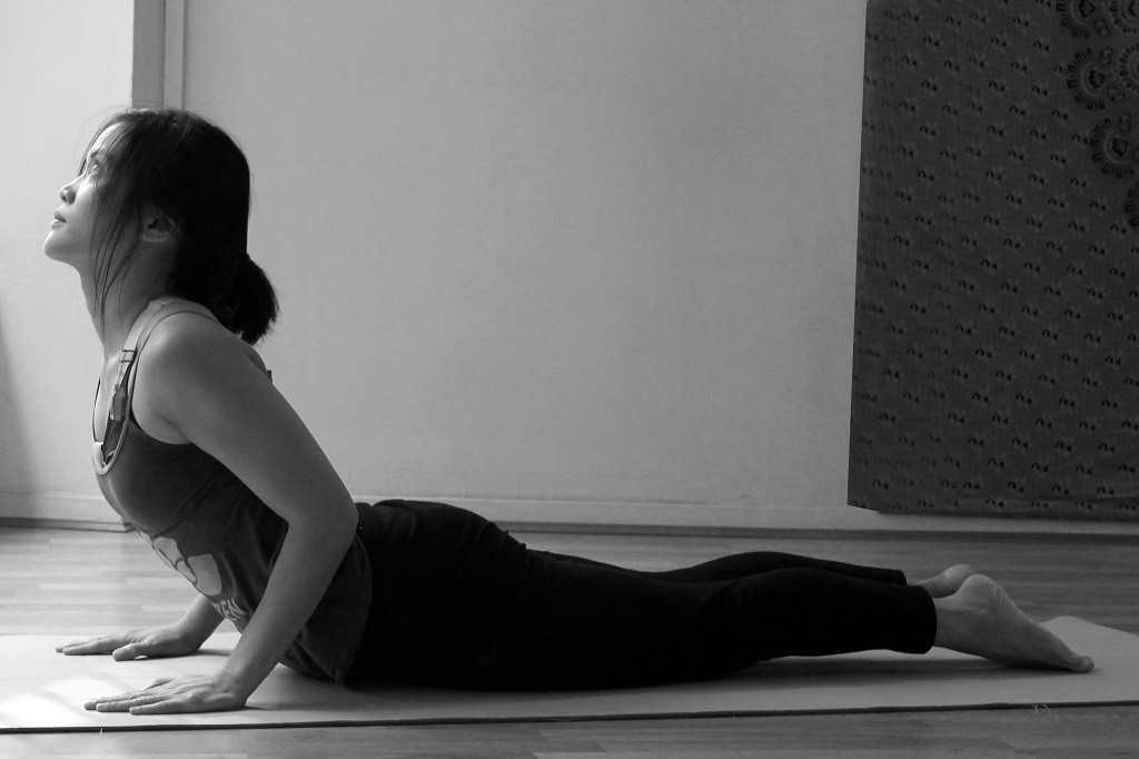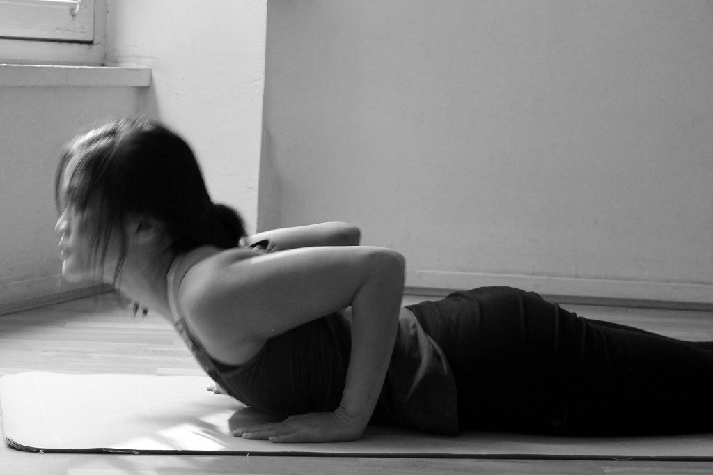 Toujours dans l’inspiration, ouvrir la poitrine et ramener la tête en arrière autant que possible. Les mains n’ont pas bougé, les épaules sont droites poussant vers le bas, les pieds pointent en arrière. Gardez les coudes près des côtes. Si vous vous sentez capable d’étirer les bras, vous pouvez. Le matin, quand la nuit a été agitée, je trouve que cette posture donne de la force pour travailler sur ces émotions.