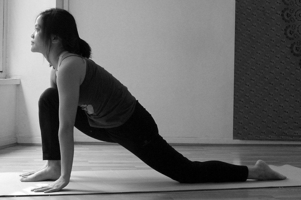 Garder les mains au même endroit et en inspirant, amener la jambe droite le plus loin possible en arrière. Le genou droit est à terre, le pied droit pointé vers l’arrière. Vous pouvez au fur et à mesure de votre pratique pousser votre bassin vers l’avant avec le genou à 90 degrés au dessus de votre cheville. Je regarde loin droit devant et vers le haut pour continuer cette pratique méditative en mouvement. J’aime penser qu’après être revenu vers soi, on regarde le monde avec l’œil du débutant. Jambe droite et gauche seront alternées à chaque tour de salutation au soleil.