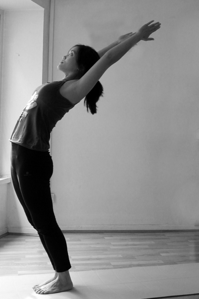 Inspirer et lever les bras vers le ciel. Les bras sont proches des oreilles et les genoux sont droits. Les hanches poussent vers l’avant. Rappelez-vous de ne pas relâcher la tête en arrière. En Ayurveda, on parle de l’élément Vata constitué d’air et d’éther souvent responsable de déséquilibres dans notre société occidentale, notamment dû au stress qui crée de l’agitation mental. Chez moi, certaine fois cela se manifeste par des craquements articulaires appelés phénomène de cavitation suivie d’une sensation de bien-être.