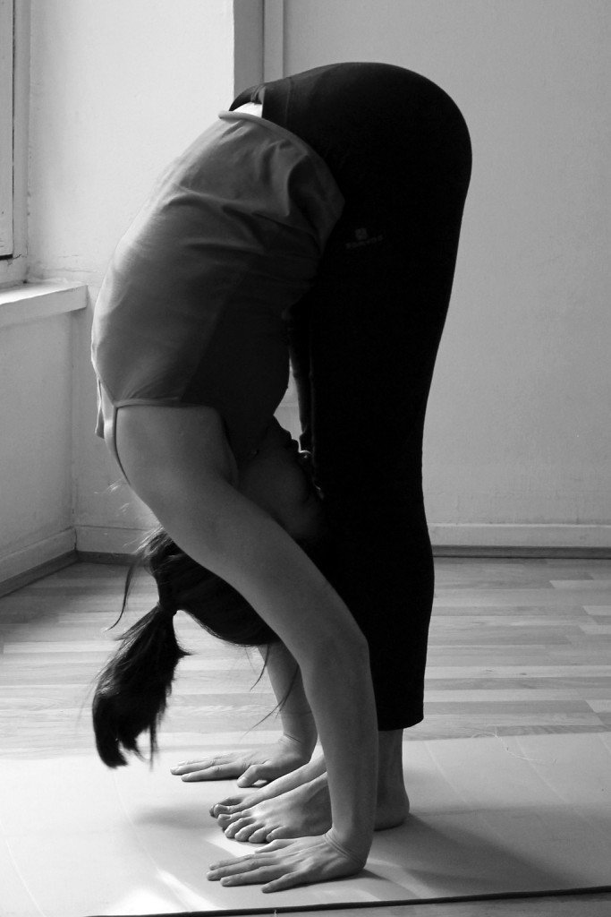 Expirer et se pencher vers l’avant en plaçant les paumes des mains de part et d’autre des pieds. Le nez vers les genoux. Si vous n’arrivez pas à placer les mains sur le sol, n’hésitez pas à plier légèrement les genoux. Apprendre à expirer est souvent le plus difficile pour nous. J’expire souvent plus vite que j’inspire. Je prends ce qui vient à moi mais est-ce que je relâche assez facilement ou est-ce que je retiens et je m’attache ? J’aime penser en pratiquant que cela m’apprend à me détacher, à abandonner à la Terre, à mourir… à mieux vivre.
