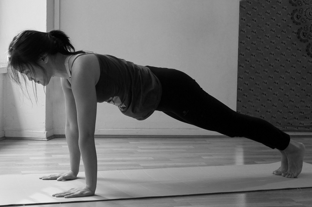 Maintenir le souffle et ramener la jambe gauche. Ici le corps forme une ligne droite de la tête jusqu’au talon. Votre regard doit être vers le sol mais la nuque longue, vos bras toniques, la sangle abdominale activée et les jambes bien tendues. C’est souvent la posture la plus difficile à faire dans cette salutation au soleil car tout le corps est tonique mais on ne s’écroule pas. Je sens rapidement si j’ai beaucoup d’énergie lorsque j’arrive dans ce mouvement. Si ce n’est pas le cas, après la salutation au soleil, je reviens dans cette posture ou le dauphin.