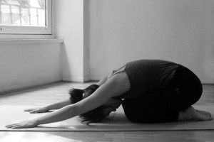 Posture yoga assis sur les talons, le ventre contre les cuisses, la tête au sol, les bras vers l’avant réalisée par Kissline Mai, professeur de yoga à Lyon