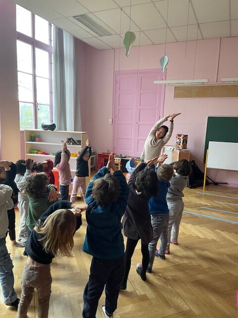 La maternelle de la Gare d’eau (Lyon 9) m’a invitée à initier les enfants au yoga. Quelle joie pour moi de partager avec 22 enfants. Le groupe dans lequel je suis intervenue avait une véritable harmonie malgré les différences d’âge (3 niveaux). Tous les enfants ont pratiqué tous les jeux proposés. C’était un fin mélange de joie, de détente, de calme. La maîtresse m’a dit qu’elle était même étonnée car certains enfants qui ont d’habitude beaucoup d’énergie avaient vraiment réussi à se relaxer et à se calmer.