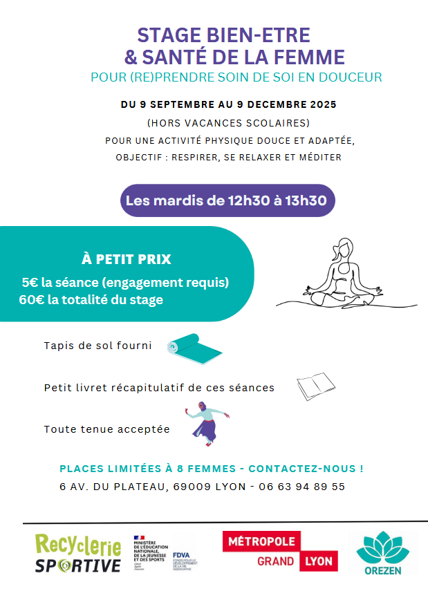 Les mardis à 12h30, 8 femmes peuvent participer à une séance de yoga. La séance revient à 5 euros grâce à la subvention de la métropole Grand Lyon mais un co-financement est également possible selon les situations financières des femmes avec l’aide d’Orezen grâce aux dons reçus.