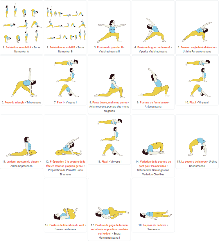 Ici, on intègre des postures de force et d’équilibre comme le Guerrier II (Virabhadrasana II), le Guerrier renversé (Viparita Virabhadrasana).